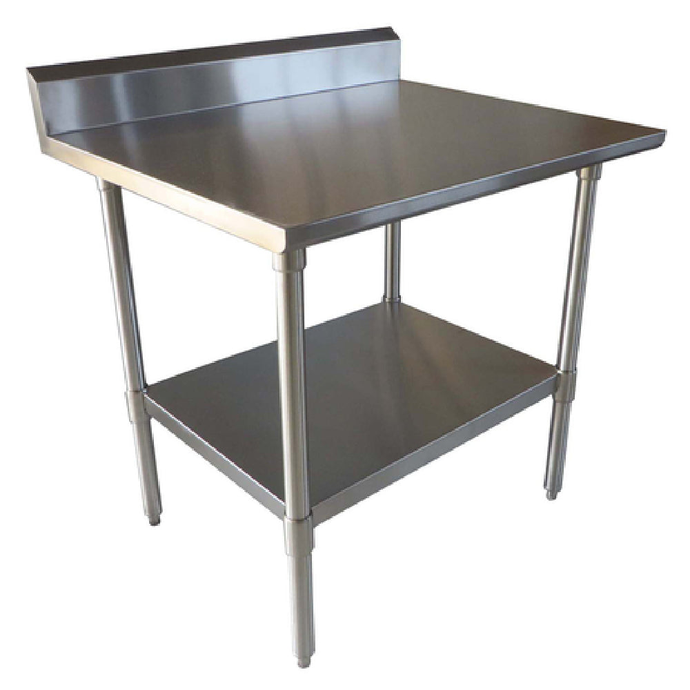 NBR Equipment, TS-3030R5, Premium Work Table, 30"W x 30"D x 40-3/4"H overall size, 18/430 stainless steel top with 5"H backsplash, straight turndown on sides, stainless steel adjustable undershelf, (4) stainless steel legs & adjustable bullet feet, NSF