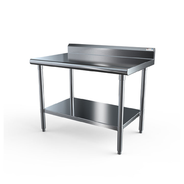 NBR Equipment, TS6-3630R5, Premium Work Table, 36"W x 30"D x 40-3/4"H overall size, 16/304 stainless steel top with 5" backsplash, 1-1/2" bullnose front edge, stainless steel adjustable undershelf, (4) 1-5/8" tubular stainless steel legs, stainless steel adjustable bullet feet, NSF