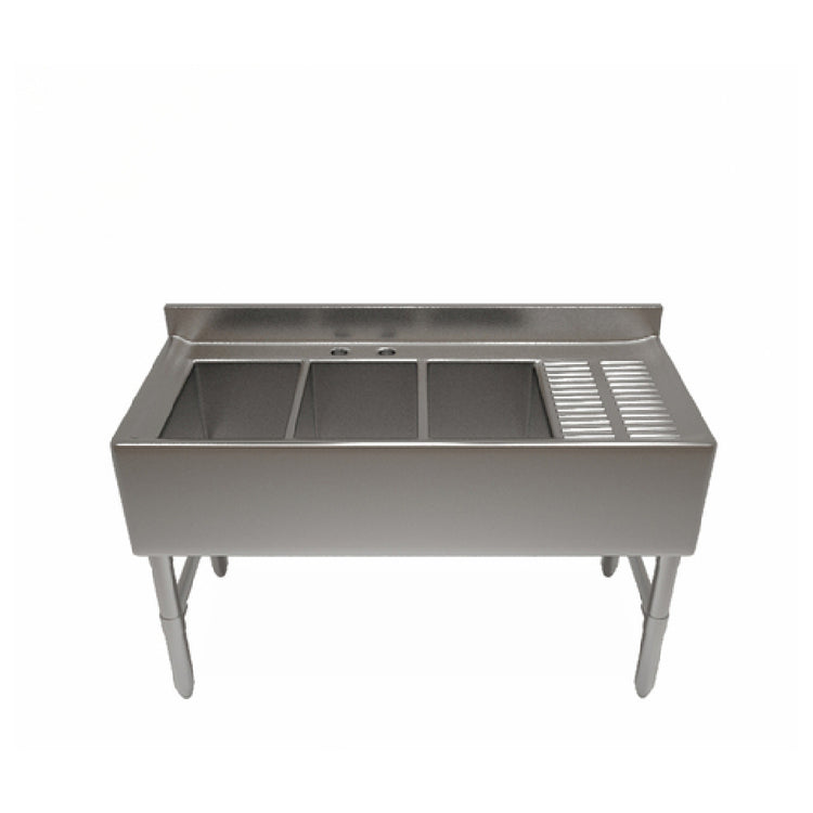The NBR Equipment UD-3-101410-48R Underbar Sink Unit is a commercial-grade, three-compartment stainless steel sink designed for professional foodservice environments. Measuring 48 inches in width with a depth of 21-1/4 inches and an overall height of 32-1/2 inches, this unit features three 10-inch wide by 14-inch front-to-back by 10-inch deep basins, providing substantial capacity for rinsing, soaking, and sanitizing tasks. Equipped with a right ribbed drainboard for efficient drying and a 3-inch splash back to contain spills, it ensures operational efficiency in busy kitchens. Constructed with durable 300 Series stainless steel, it is built for longevity and ease of maintenance. The unit includes basket drains and overflow stand pipes, with deck mount faucet holes centered at 4 inches, making it an ideal solution for high-volume foodservice operations requiring robust and reliable underbar sanitation.