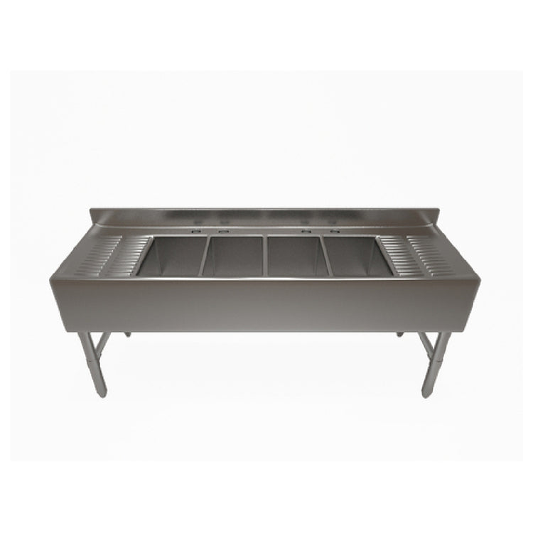 The underbar sink unit offers robust stainless steel construction, with four spacious 10" x 14" x 10" compartments for versatile washing stations. Its ribbed drainboards improve drainage efficiency, while deck mount faucet holes support easy faucet installation. Built for durability, the unit withstands rigorous commercial use, with an 18/300 series stainless steel finish requiring minimal maintenance. Designed to integrate seamlessly into bar and prep stations, it enhances workflow by providing ample space for cleaning and sanitizing utensils. Suitable for high-traffic venues, this model supports efficient dish and glassware management in busy hospitality environments.