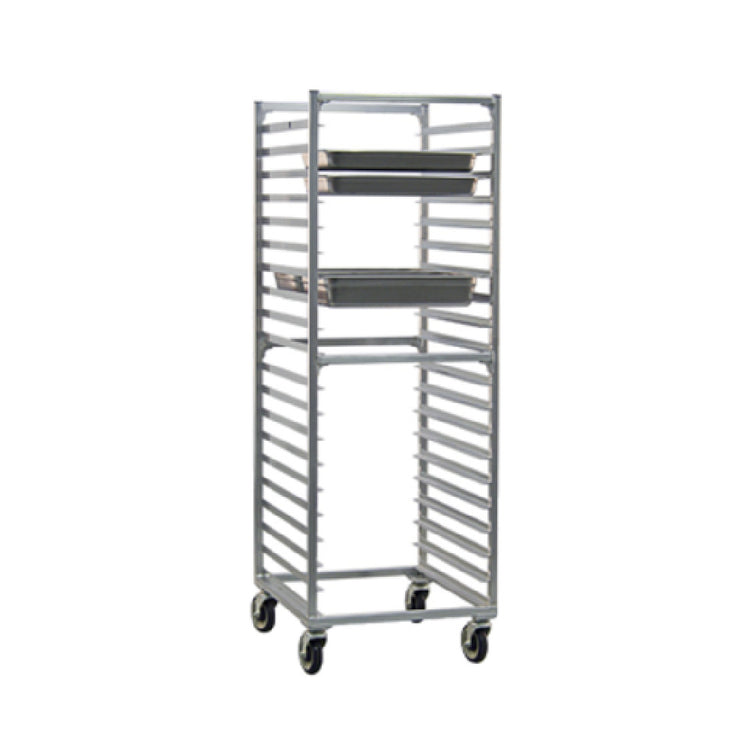 A commercial pan rack is a heavy-duty foodservice storage and transport solution designed to hold multiple steam table pans efficiently. Typically constructed from durable materials such as aluminum or stainless steel, it supports organized, accessible, and sanitary storage in busy kitchens or buffet lines. The New Age Industrial 1509 Steam Table Pan Rack is a full-height, open-sided model equipped with slides and casters, making it well-suited for high-volume catering, buffet service, and hot-holding stations. Its technical features optimize workflow, facilitate easy cleaning, and ensure long-term operational performance in demanding foodservice environments.