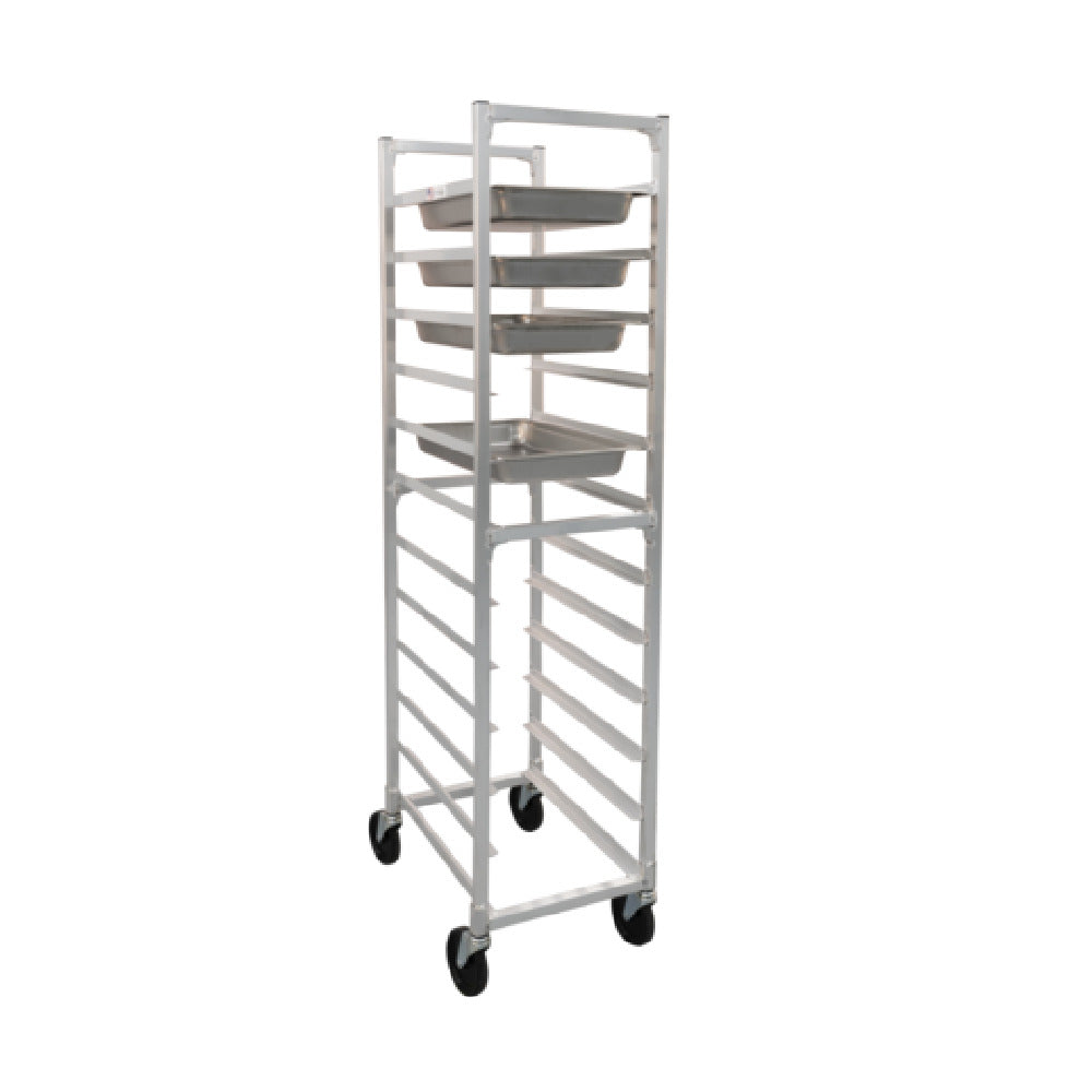The New Age Industrial 52199 Steam Table Pan Rack offers a robust all-welded aluminum construction with a stainless steel top, ensuring excellent durability and corrosion resistance. Its open side design simplifies pan accessibility and stacking in fast-paced kitchen settings. The rack’s capacity to hold ten full-size hotel pans and ease of mobility with four stem casters support streamlined workflow. Its end-loading configuration enhances productivity, while the 69" height provides ample storage space. Designed for moderate-volume foodservice environments, this rack supports efficient space utilization and sanitation standards.