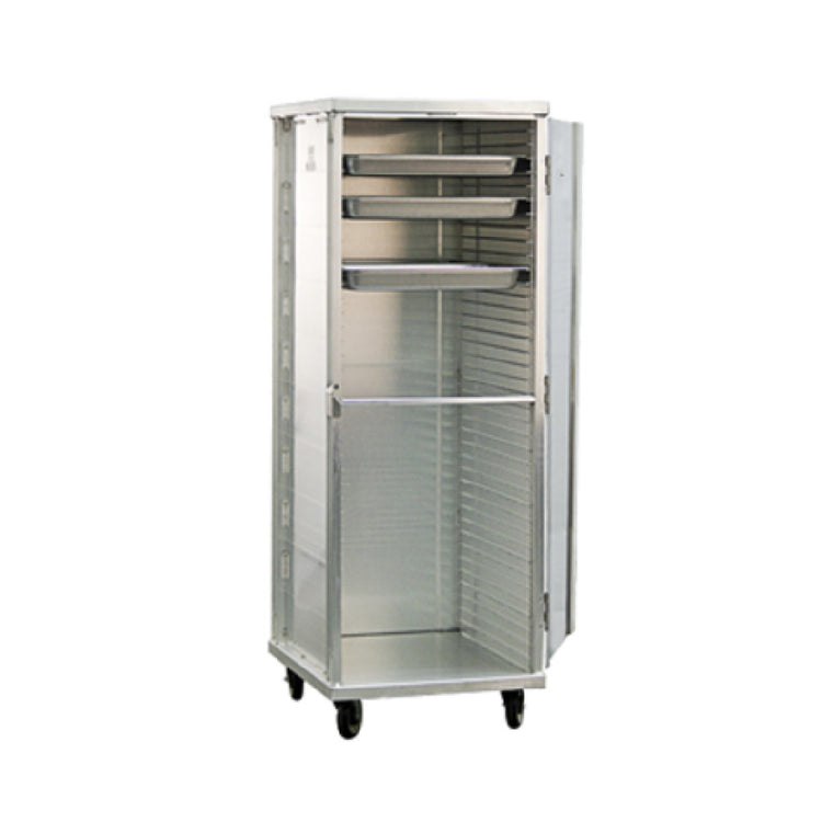 Engineered for commercial foodservice environments, this mobile pan rack incorporates precision-fitted sliding mechanisms on 1-1/2" centers, supporting (24) standard 12" x 20" pans. The welded aluminum construction ensures resistance to corrosion and frequent cleaning, while the four swivel casters enable smooth mobility. The full-height enclosed doors streamline access and sanitation, making it suitable for high throughput operations such as catering, cafeterias, and bakery applications. The unit is designed for durability, ease of maintenance, and seamless workflow integration in demanding kitchen settings.