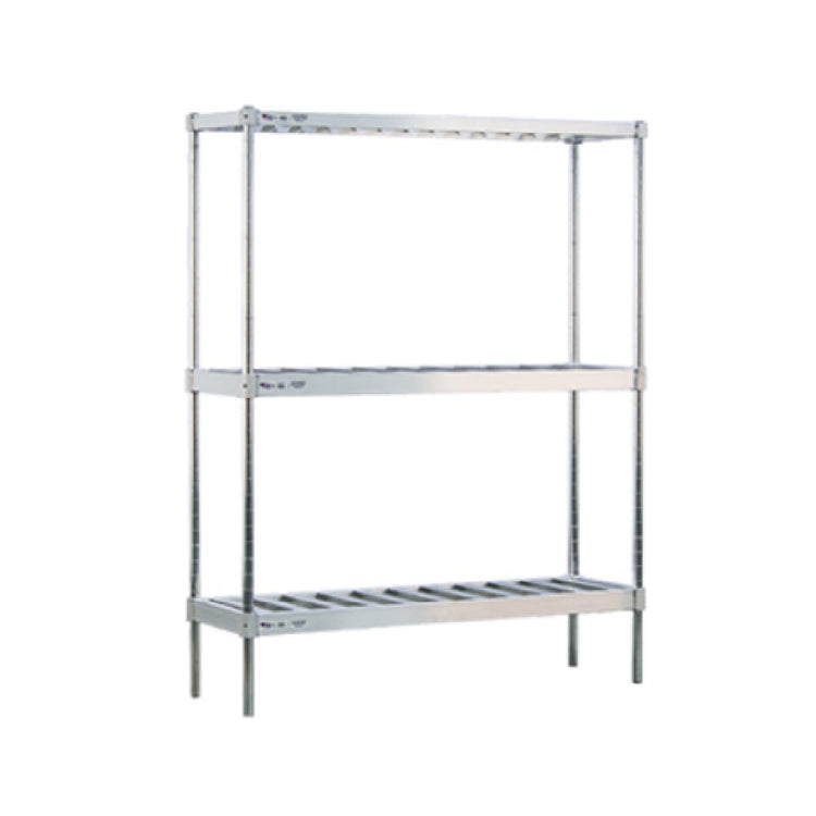The New Age NS933 Keg Rack features a durable aluminum frame with a generous capacity for multiple keg sizes, facilitating streamlined workflow in high-volume beverage service. Its three "T"-Bar shelves are designed for stability and easy cleaning, reducing maintenance time. The rack’s dimensions maximize storage density while ensuring easy access to kegs, ideal for busy commercial kitchens and bar areas. Built for long-lasting performance, it supports heavy loads with corrosion-resistant materials suitable for washdown environments.