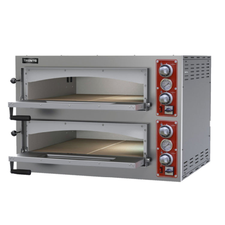 The Omcan 40636 (PE-IT-0038-D) Trento Entry Max Series Pizza Oven is a commercial-grade deck-type electric pizza baking appliance designed for high-performance food production environments. This dual-chamber oven features a 39-inch wide stainless steel exterior with hinged glass doors, providing durable construction and clear visibility for monitoring baking processes. Equipped with two mechanical thermostats per chamber, it offers precise temperature control up to a maximum of 842°F (450°C). Its interior capacity of 29.3 cubic feet enables efficient high-volume pizza baking, making it suitable for restaurant kitchens, pizzerias, and foodservice operations requiring consistent, high-temperature outputs. Manufactured in Italy, this pizza oven combines reliability, easy maintenance, and industry-standard safety features for professional food preparation.