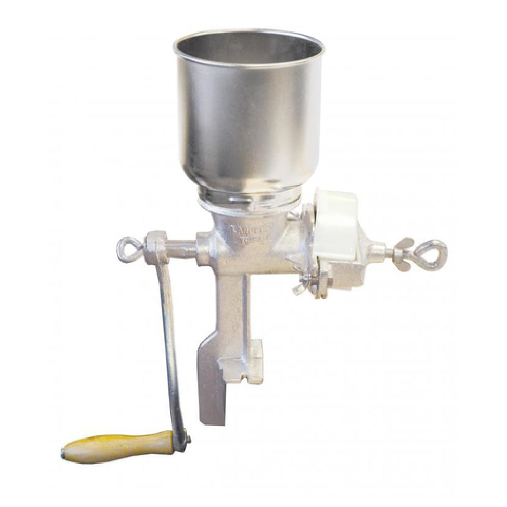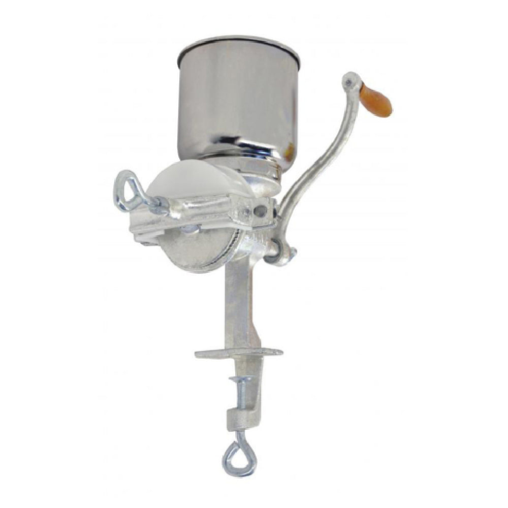Omcan USA, 41158, (41158) Mill Grinder, 15-1/2" x 11" x 14-3/4", manual, hand crank, grinds corn, soybeans, nuts & cereal, adjustable grind (course to fine), clamps to surfaces up to 1-1/2" thick, cast iron construction, tin plated