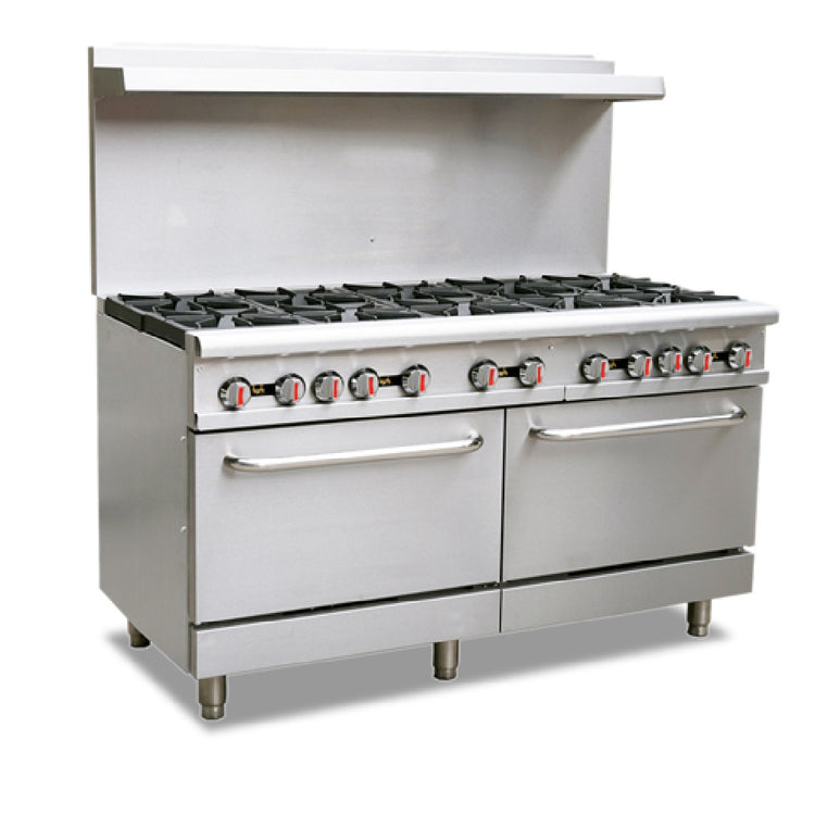A commercial range is a heavy-duty cooking appliance designed for high-volume foodservice environments, equipped with multiple burners and ovens to support diverse cooking needs. The Omcan 46027 commercial range features ten open burners, two standard ovens, and stainless steel construction, making it well-suited for restaurant kitchens, cafeterias, and catering operations. Its robust design ensures consistent performance under demanding workloads, with precise temperature controls and easy maintenance. This range is ideal for establishments requiring efficient, reliable, and versatile cooking capacity for a variety of culinary applications in busy settings.