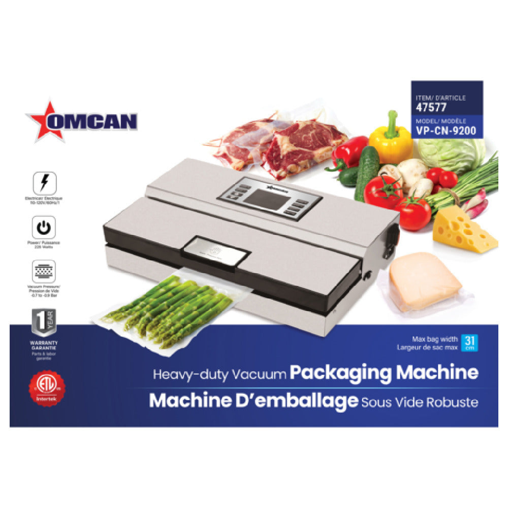 The Omcan 47577 (VP-CN-9200) Vacuum Packing Machine is a professional-grade food packaging appliance designed for commercial kitchens and foodservice operations. Featuring a 12.2-inch seal bar, this countertop unit combines pulse-vacuum and manual control functions for precise bag sealing, enhancing product preservation and inventory management. It operates on 225 W power with a voltage range of 110-120V at 60Hz and incorporates a canister function, making it suitable for vacuum sealing liquids and delicate foods efficiently. Its technical specifications prioritize durability and performance in high-volume food packaging environments, supporting consistent results and operational efficiency.