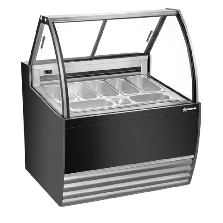 Omcan USA, 49006, (FR-CN-0007B) Gelato Display Showcase, 41"W, (7) pan capacity, curved front glass, digital controller, LED lighting, sliding rear doors, 10.4° to -7.6°F (-12° to -22°C) temperature range, (4) casters (2 with brakes), ventilating cooling system, automatic defrost, R290 Hydrocarbon refrigerant, black exterior, 1300 watts, 110-120v/60/1-ph, cord, 11.8 amps, NEMA 5-15P, cETLus, ETL Sanitation