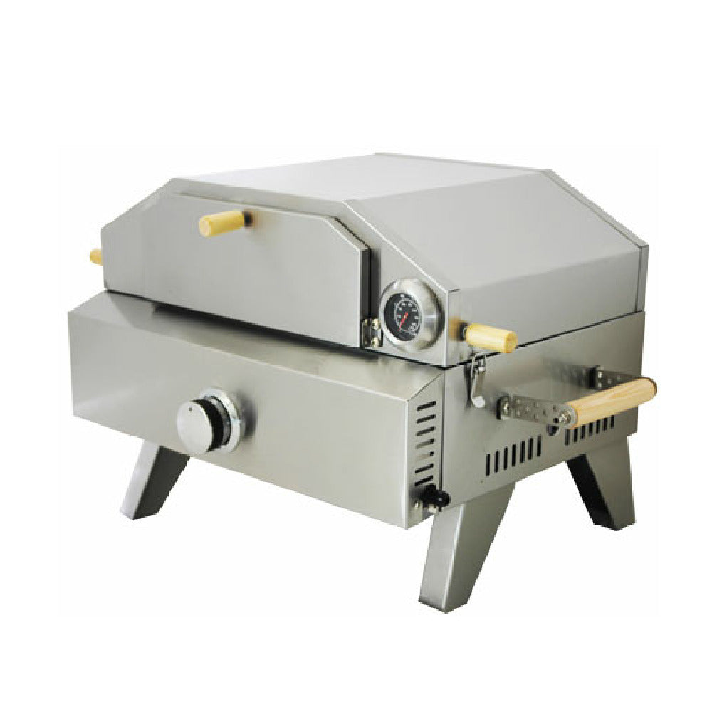 This pizza oven combines durable stainless steel housing with a 12,000 BTU propane gas heating system, offering rapid preheating and consistent cooking. Its foldable legs facilitate deployment in limited spaces, while the included pizza stone enhances heat transfer and breadcrust development. Designed for moderate throughput, it supports seamless workflow integration for pizza preparation in commercial kitchens and mobile food trucks, providing both ease of operation and maintenance.