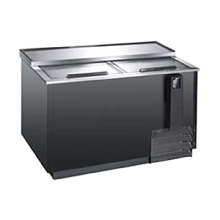 The Omcan 50039 (BB-CN-0014-HC) Beer Bottle Cooler Horizontal Chest 49.5"W is a commercial-grade beverage storage unit designed for efficient cold preservation of 12 oz. bottles and cans within foodservice environments. Constructed by Omcan USA, this horizontal chest cooler features a spacious 13.5 cubic foot (382 liters) capacity, accommodating up to 16.5 cases of bottles or 24 cases of cans. Its self-contained refrigeration system with ventilated cooling ensures uniform temperature distribution across an all-black exterior and aluminum interior, operating within a precise temperature range of 33°F to 38°F (0.5°C to 3.3°C). Equipped with lockable sliding stainless steel lids and a durable, corrosion-resistant build, it is suited for bar, restaurant, or hospitality settings requiring reliable, easy-access cold storage solutions for high-volume beverage service. The model boasts a 1/6 HP compressor, energy-efficient hydrocarbon refrigerant, and complies with ETL sanitation standards, ensuring safe and sanitary operation in commercial food and beverage operations.