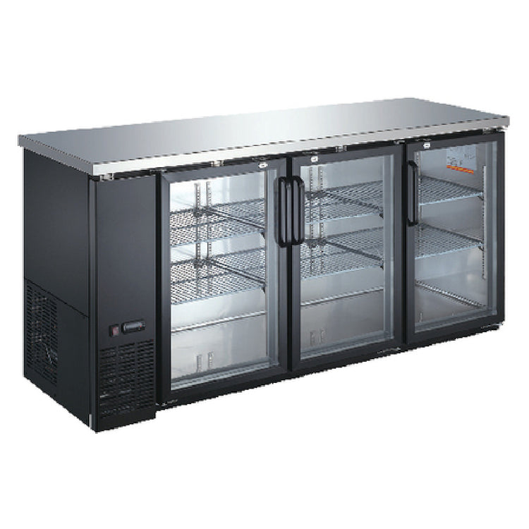 The Omcan 50062 (BB-CN-0020-GH) Refrigerated Back Bar Cooler Reach-in Three-section is a commercial-grade refrigeration unit designed for efficient beverage storage in professional hospitality environments. This three-section, side-mounted self-contained refrigerator features a robust 72.75-inch width and a height of 35.6 inches, optimized for front-of-house deployment. Equipped with glass hinged doors, six adjustable plastic shelves, and LED lighting, it ensures optimal product visibility and organization. The stainless steel top surface enhances durability, while the black exterior coating provides wear resistance. Operating within a precise temperature range of 33°F to 41°F (0.5°C to 5°C), it maintains product freshness for cans, bottles, or kegs. Powering this unit is a 1/4 HP system with R290 hydrocarbon refrigerant, delivering reliable cooling performance in busy foodservice settings. The unit’s dimensions and capacity of 19.6 cubic feet support versatile beverage storage, making it suitable for bars, restaurants, and catering operations requiring consistent, accessible refrigeration for high-volume serving needs.