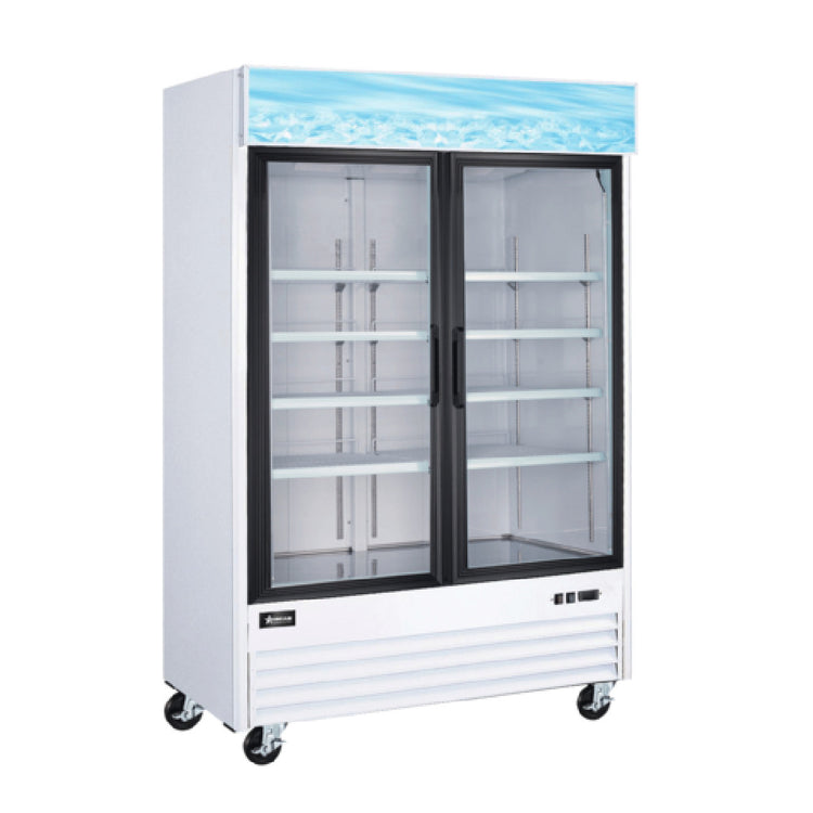 Omcan USA, 52032, (RE-CN-0045-HC-SW) Refrigerator, reach-in display, two-section, bottom mount self-contained refrigeration, 45 cu.ft (1270 liters) interior capacity, 33°F to 41°F (0.5°C to 5°C), (2) self-closing hinged glass doors, (8) plastic coated shelves with tag holder, removable installation board, automatic defrost, polyurethane insulation, painted steel exterior, white, R290 Hydrocarbon refrigerant, 1/4 HP, 110v/60/1-ph, 4.3 amps, cord, NEMA 5-15P, cETLus, ETL-Sanitation (shipped on pallet)