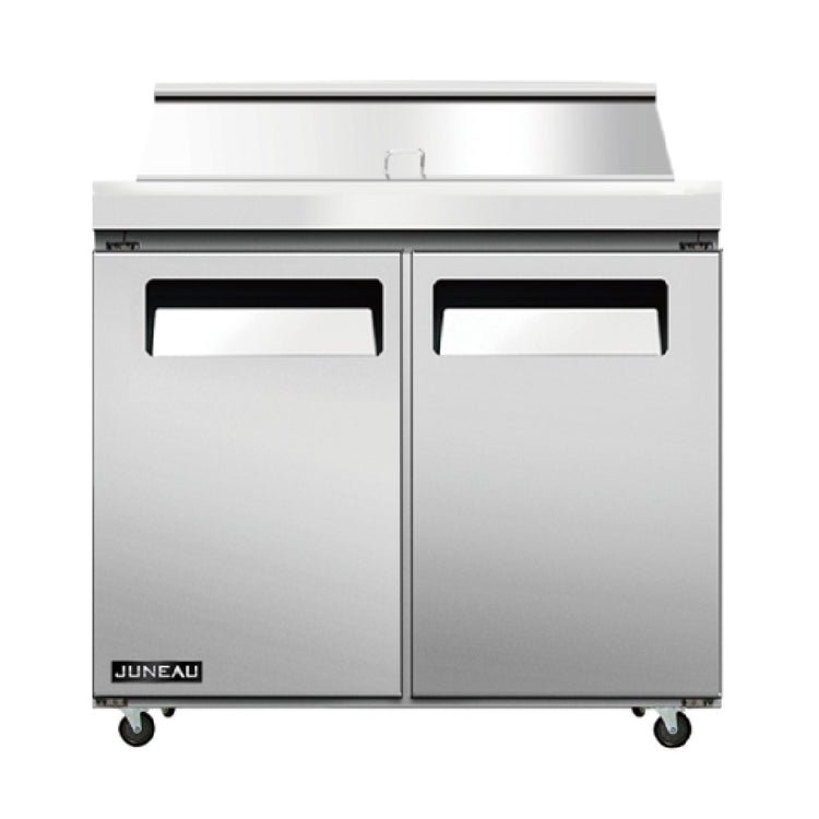 Omcan USA, 58006, (PT-TH-0920-HC) Juneau Refrigerated Prep Table, two-section, rear mount self-contained refrigeration, 36"W, 4.9 cu.ft. capacity, 33°F to 40°F (0.5°C to 4°C) temperature range, accommodates (10) 1/6 pans, digital controller, (2) self-closing doors, (2) adjustable PVC coated shelves, stainless steel interior & exterior, (4) casters (2 with brakes), R290 Hydrocarbon refrigerant, 510 watts, 115v/60/1-ph, cETLus, ETL-Sanitation