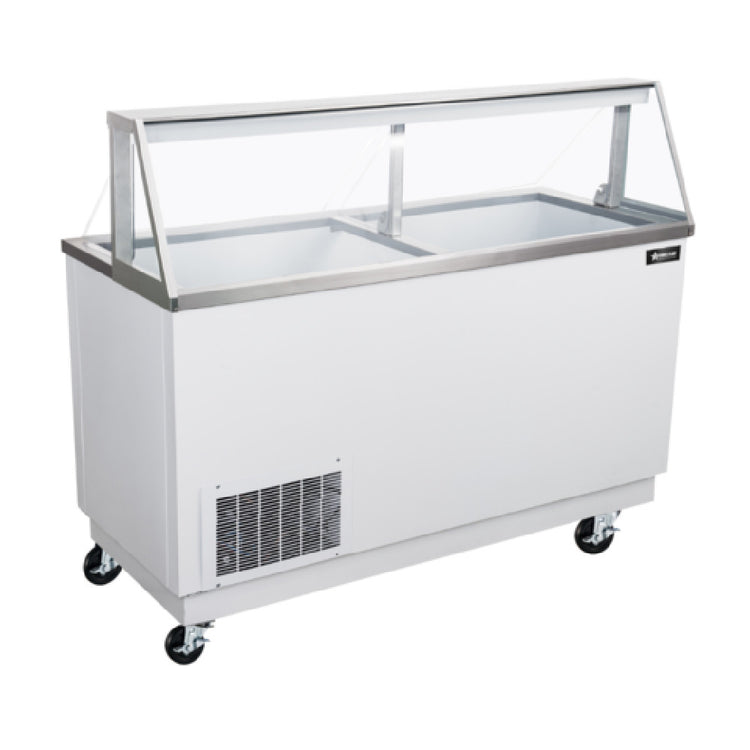 Omcan USA, 50121, (FR-CN-0068) Ice Cream Dipping Display, 68"W, (12) 3 gallon tub capacity, (8) storage, (2) sliding doors with locks, sneeze guard, automatic defrost, white exterior, casters, R290 Hydrocarbon refrigerant, 115v/60/1-ph, 5.64 amps, NEMA 5-15P, cETLus, ETL-Sanitation