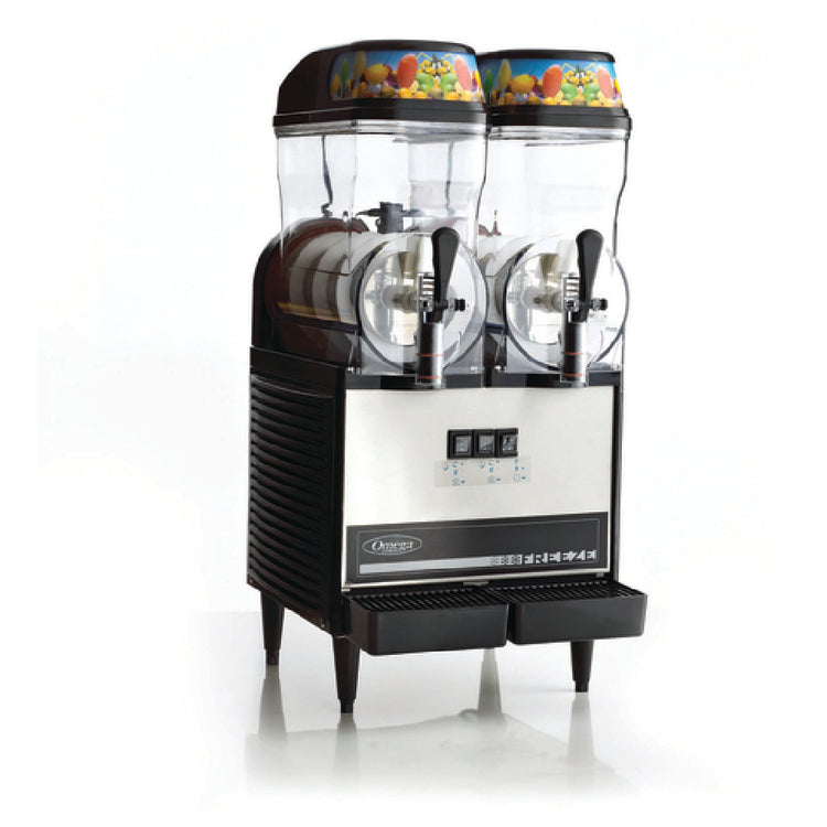 The Omega OFS20 features a self-contained refrigeration system powered by a 710-watt, 1/2 HP motor, operating at standard electrical requirements. Its refrigeration is air-cooled, supporting consistent operation in various commercial kitchen environments. The unit measures approximately 15" wide, 18.5" deep, and stands 33.25" high, weighing 109 lbs for stability and easy placement. The stainless steel construction and propylene plastics ensure food safety and ease of cleaning, compatible with standard sanitizing routines. It is designed for moderate throughput, producing ample amounts of non-carbonated frozen beverages daily, ideal for medium-sized foodservice operations.