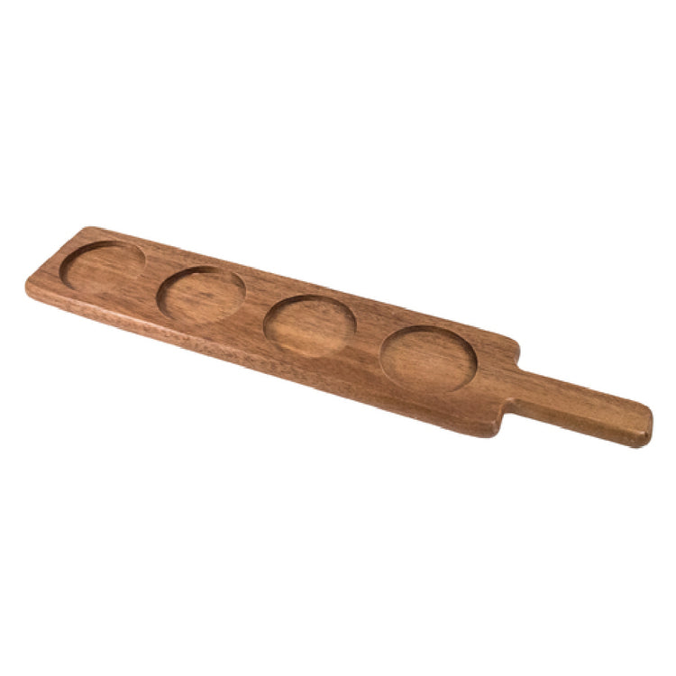 This flight serving paddle offers four 2-1/2" wells designed for efficient beverage tastings, with a total size of 17-1/2" x 3-1/2". Its acacia wood material provides durability, resistance to scratches, and an attractive natural look, while dishwasher safety ensures ease of maintenance. The compact footprint supports streamlined service in busy bar environments or wine tastings. Its ergonomic design allows for easy handling and presentation, facilitating improved workflow in foodservice operations that require quick turnaround and consistent presentation standards.