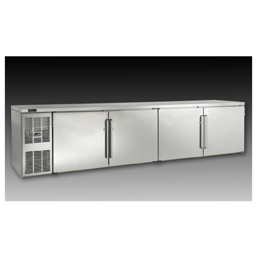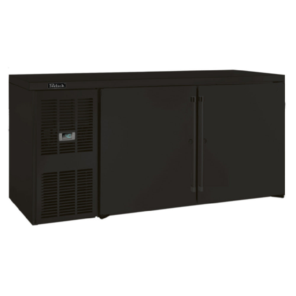 The Perlick BBSLP60_BLSDC Low Profile Refrigerated Back Bar Cabinet Two-section 60"W is a commercial-grade refrigeration unit designed for efficient beverage storage in bar and hospitality environments. It features self-contained side mount refrigeration with precise digital thermostat control, providing an internal volume of 13.3 cubic feet. The cabinet’s construction includes stainless steel interior surfaces and a rugged black exterior finish, ensuring durability and ease of cleaning. Its 29-inch height and 60-inch width optimize space utilization while maintaining compliance with industry standards. Equipped with hinged locking doors, LED interior lighting, and front vented airflow for effortless operation, this unit suits high-demand service settings requiring reliable temperature management and secure storage of chilled beverages. The model utilizes R290 hydrocarbon refrigerant for environmentally conscious cooling, with a side-mounted compressor delivering 1/5 HP, suitable for mid-volume foodservice needs.