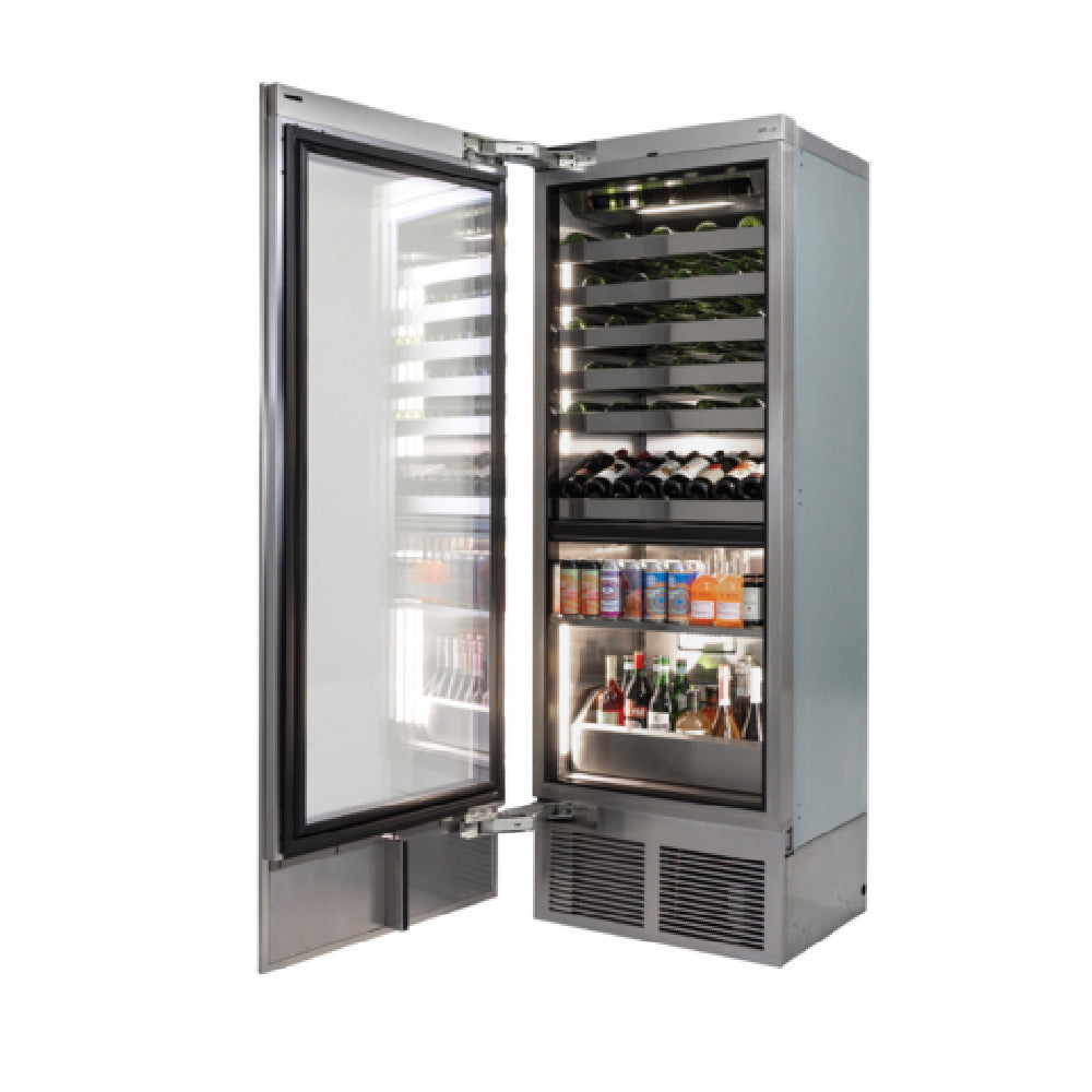 The Perlick CC30C-2-4RL Beverage Column Refrigerator Dual-zone is a commercial-grade refrigeration unit designed for precise storage and display of wine and canned beverages. As a product within Perlick's renowned commercial refrigeration line, this dual-zone merchandiser features a spacious 16.9 cubic feet capacity, measuring 29-3/4 inches in width, 24-1/16 inches in depth, and 84 inches in height. Equipped with a glass door and LED lighting, it offers optimal visibility and accessibility. The unit includes five full extension wine shelves, a convertible display shelf, stainless steel flat shelf, full extension stainless steel bin, capable of holding up to 55 bottles and 230 cans, making it suitable for high-volume retail and hospitality environments. Its self-contained refrigeration system uses R600a refrigerant, with an air-cooled mechanism. The model ensures consistent temperature control with precise dual-zone cooling, tailored for wine and beverage preservation, and is rated for a 115V/60Hz supply with a 3.2 amp draw and a 5-foot NEMA 5-15P cord. Designed for durability and performance, this unit incorporates cULus compliance and premium construction for reliable commercial operation.