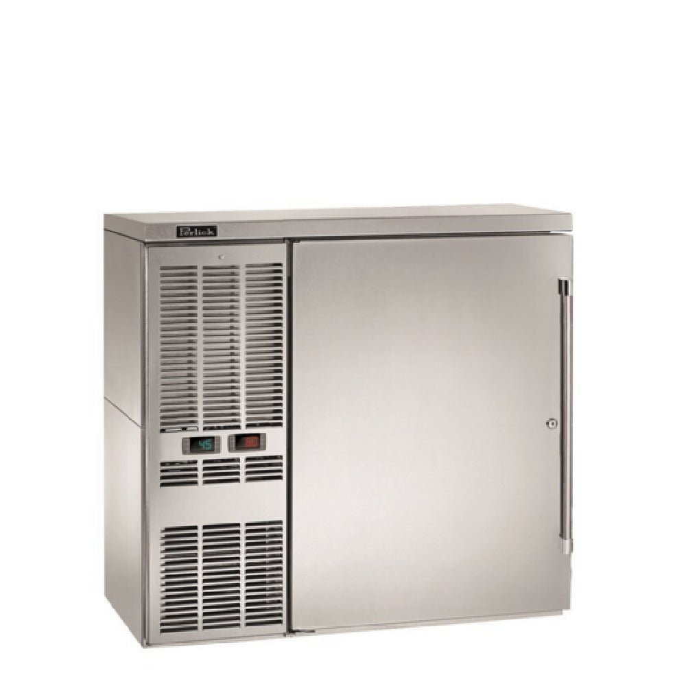 The Perlick DZS36_SSRSD_WW Dual-Zone Refrigerated Back Bar Storage Cabinet One-section exemplifies commercial-grade refrigeration designed for professional beverage and cocktail service environments. This self-contained unit measures 36 inches in width and features dual-zone temperature control within a 7.1 cubic foot interior. Constructed with stainless steel interior and a stainless steel top, it offers durability and sanitation suited for busy bars, restaurants, and hospitality venues. Equipped with a digital thermostat and front-vented refrigeration system, it ensures efficient cooling and consistent temperature management ideal for storing chilled bottles or bar ingredients. Its side-mounted compressor and hydrocarbon refrigerant enable energy-efficient operation, making it a reliable asset in high-demand foodservice settings.