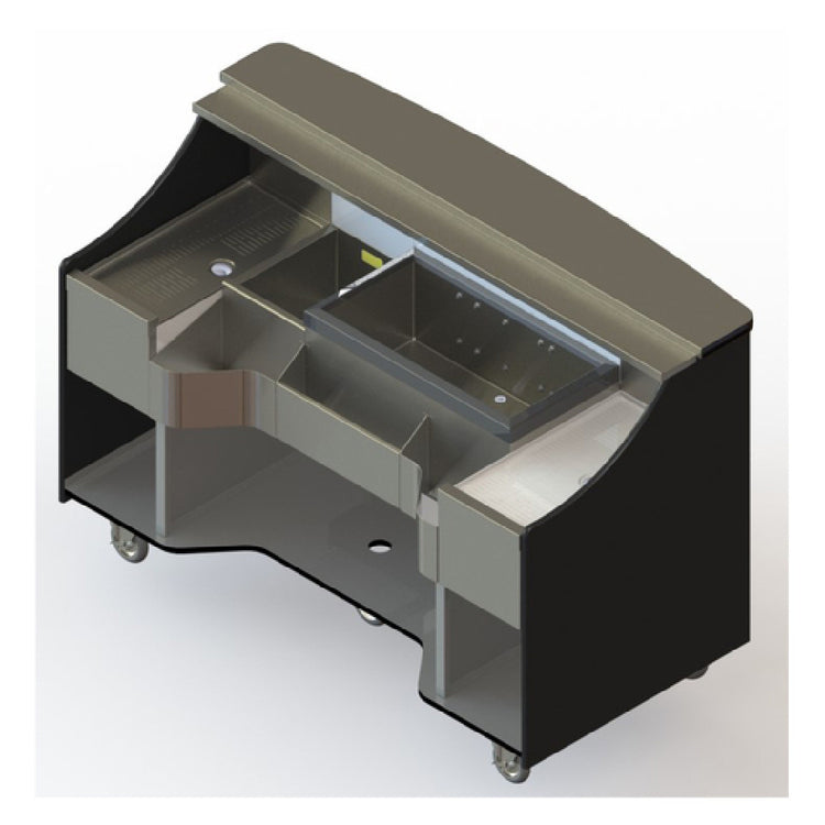 The Perlick MOBS-66TE Signature Series Mobile Bar includes integrated features tailored for commercial beverage service, such as a 12-inch insulated bottle well for quick access, dual 12-inch drainboards for effective cleanup, and LED task lighting for improved visibility. Its stainless steel framing facilitates easy sanitization and long-term durability, while the 66-inch curved speed rail supports efficient glass storage. With a self-contained refrigeration system and an ice melt drain tank, it manages cooling and drainage seamlessly, supporting moderate throughput environments like event catering and outdoor service stations.