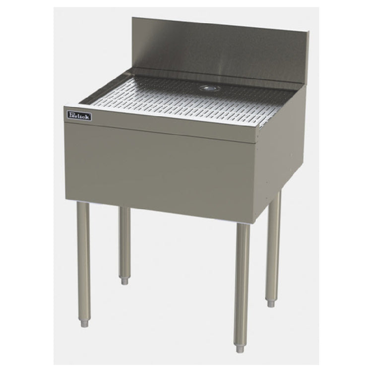 The Perlick TSF12DB TSF Series Underbar Drainboard with a 12-inch width and 24-inch depth offers a robust, all-stainless steel drainage solution designed for commercial foodservice environments requiring durable and efficient workstation organization. This free-standing unit features a pitched drainboard top for optimal water flow, a 6-inch splash guard to contain spills, and a backsplash to protect prep surfaces. Its construction includes stainless steel legs with adjustable thermoplastic feet, facilitating stable installation and easy height adjustments, while the Perlick Quick Clamp tool-less leg attachment enables rapid setup and maintenance, making it ideal for bartenders, chefs, and bar stations seeking high-performance work surfaces.