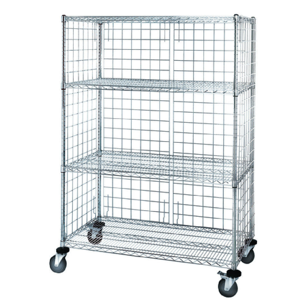 A commercial mobile enclosure cart is a durable steel or wire-based storage unit designed for secure containment and easy transportation of supplies or equipment in foodservice settings. The Quantum M2460C46E specifically features a sturdy chrome-plated steel frame with four wire shelves and enclosure panels, optimized for use in busy kitchens or storage areas. Such carts are typically installed in restaurant backrooms, catering operations, or large-scale food preparation zones, providing flexible, hygienic storage options suitable for moderate workload environments or high-turnover workflows, enhancing operational efficiency and sanitation standards.