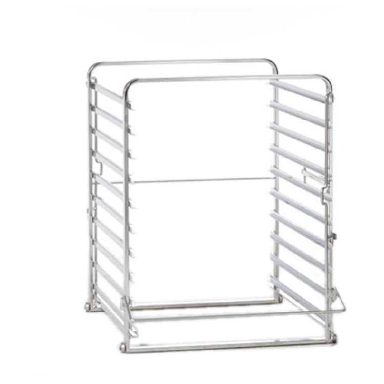 This oven rack mobile is engineered for seamless integration into busy commercial kitchens, providing robust mobility and carrying capacity. Its stainless steel construction ensures corrosion resistance and durability, while its compatibility with transport carts and run-in rails simplifies stacking and movement. The ability to hold 10 pans accommodates moderate throughput, optimizing oven load management and workflow efficiency in bakery and catering operations.