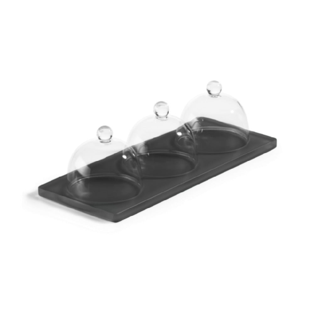 Revol USA, 411894, Cloche & Base Set, (SHIPS FROM FRANCE), 9-3/4"W x 3-1/2"D x 3"H, rectangular, includes: (3) cloche and shockproof, thermal shock resistant (-148°F to + 176°F), food safe, non-porous, dishwasher safe, Nacryl® resin base, anthracite, Made in France (Packed By: 6 Each Per Case)