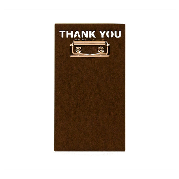 Risch MDF-CHECK-CLIP 5X9 stands out with its stain and water-resistant hardboard, sturdy metal clip, and sleek dark brown finish. Its American-made construction and precise dimensions ensure seamless integration into commercial tabletop setups, offering durability and professional appeal. The "Thank You" cutout adds a courteous detail that enhances guest interactions and check presentation efficiency, distinguishing it from standard check holders.