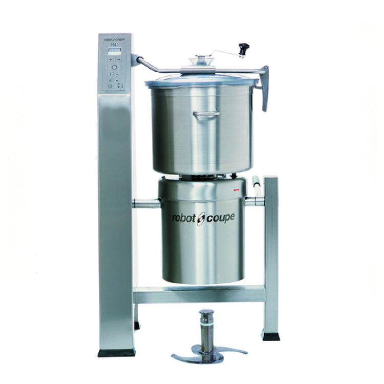 This commercial blender and mixer offers high-capacity processing with a 45-liter stainless steel bowl, adjustable blades for precise texture control, and a digital timer for automation. Its vertical design and stainless steel build provide durability, while the tilting bowl facilitates maintenance. Ideal for large-scale foodservice use, it ensures reliable performance in high-volume operations.