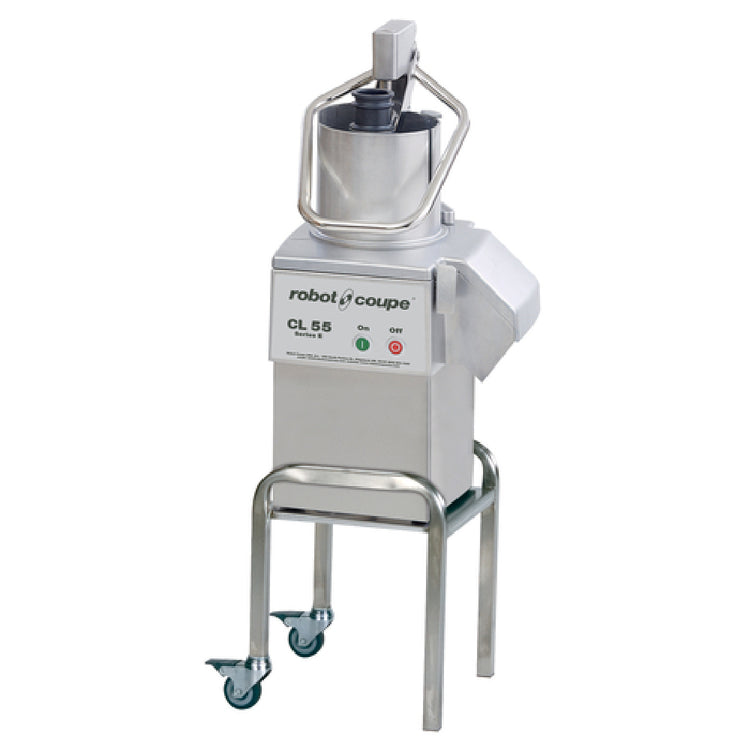 The Robot Coupe CL55E NODISC features a 2-1/2 HP motor and stainless steel construction designed for intensive food processing tasks. It includes a vegetable prep attachment with a pusher feedhead and auto restart for efficient, hygienic preparation. The stand with casters ensures portability, while the single-speed operation optimizes workflow. This model is ideal for high-volume establishments needing durable, precise equipment to streamline prep processes in busy kitchens.