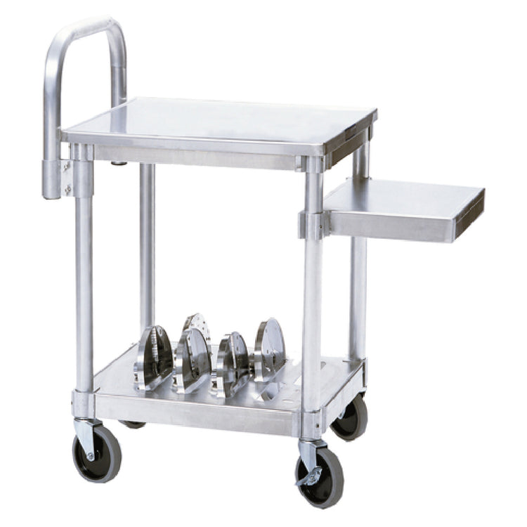 The Robot Coupe R199 Robo-Cart Equipment Stand is a commercial-grade storage and support solution designed for foodservice environments requiring durability and flexibility. Crafted from heavy-duty aluminum with stainless steel insert shelving, this equipment stand measures 18-9/16 inches in width, 34-1/8 inches in depth, and stands 38-1/2 inches high. Notable for its adjustable aluminum cantilever shelf (adjustable from 10-3/16 to 27-1/2 inches in height), it provides optimal storage and workspace configuration. Its stainless steel insert with ten cutting disc slots enables efficient organization of preparation accessories, while the adjustable handle enhances maneuverability. Equipped with five-inch heavy-duty swivel casters supporting up to 200 pounds, this stand is engineered for stability and ease of repositioning in busy commercial kitchens, bakeries, or food prep stations. Its robust construction ensures longevity in high-demand environments, accommodating diverse food processing and prep tasks with precise fixture placement and storage versatility.