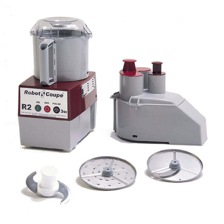 A commercial food processor is a heavy-duty countertop appliance used for rapid and precise food preparation in professional kitchens. The Robot Coupe R2N model is a combination unit featuring a 3-liter gray polycarbonate bowl with handle, ideal for vegetable prep, slicing, and grating tasks. Equipped with a 1 HP motor and external attachments, it supports moderate throughput requirements, making it suitable for mid-volume foodservice environments such as cafes, catering, and small restaurants. Installed in food prep stations, this processor improves efficiency while maintaining high standards of sanitation and uniformity in processed foods.