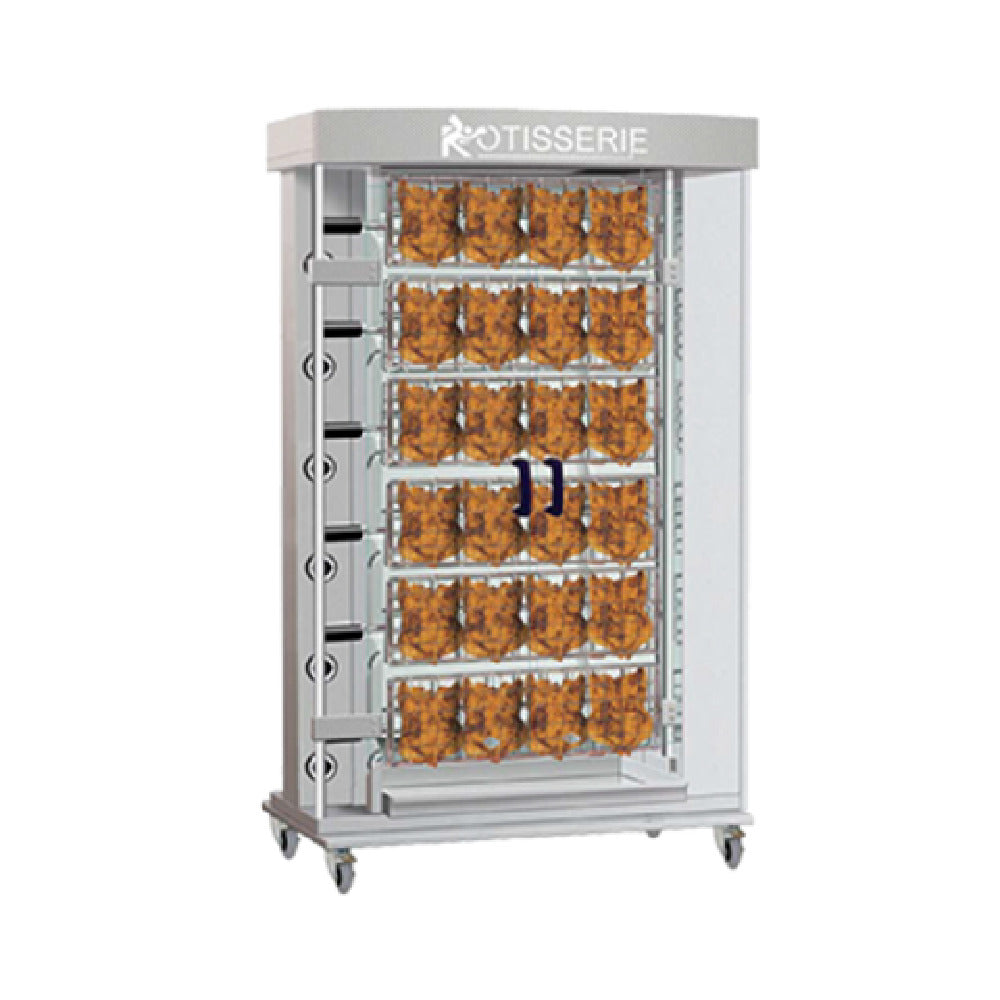 A commercial rotisserie oven is a heavy-duty cooking appliance designed for roasting poultry and other meats with consistent heat and rotation. The Rotisol FFS1175-6G-SS_NAT is a gas-powered rotisserie oven suitable for restaurant kitchens, with features including multiple spits, independent motors, stainless steel construction, and a capacity of up to 24 chickens. Installed in busy foodservice settings, it provides high-volume roasting efficiency. This unit is ideal for mid-volume poultry service operations requiring quick, uniform cooking with straightforward maintenance and reliable performance.