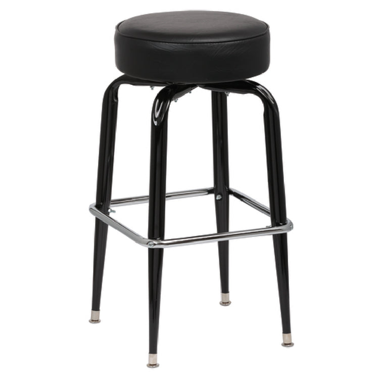 Royal Industries, ROY 7723 B, Bar Stool, 14" dia., standard seat, 4" thick tailored seat with single sewn welt, 1" thick padding, ball bearing swivel, square black frame, single chrome ring, chrome glides with nylon base, heavy-duty fabric back black vinyl, knocked down