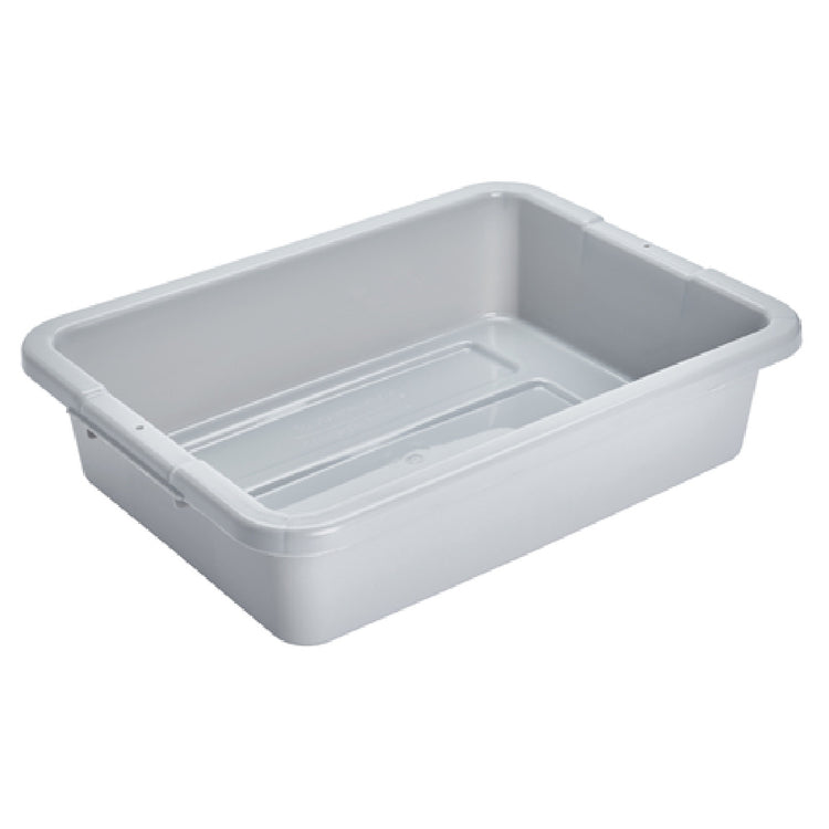 The Rubbermaid FG334900GRAY bus/utility box is constructed entirely from durable plastic with a gray finish, measuring 20 inches long by 15 inches wide and 5 inches high, and weighing 1.76 lbs. It features a 4-5/8 gallon capacity and is NSF approved, ensuring food safety standards compliance. The unit is dishwasher safe for easy sanitation and is made in the USA, supporting high-volume logistics and foodservice storage applications. Its design includes a reinforced handle and ribbed sides for added strength during handling, with rounded corners to facilitate cleaning and prevent damage. The product operates in typical commercial environments where frequent washing and transport are necessary. The model is classified as a 1-compartment bus/tub with a freight class of 150, suitable for indoor storage and transport operations.