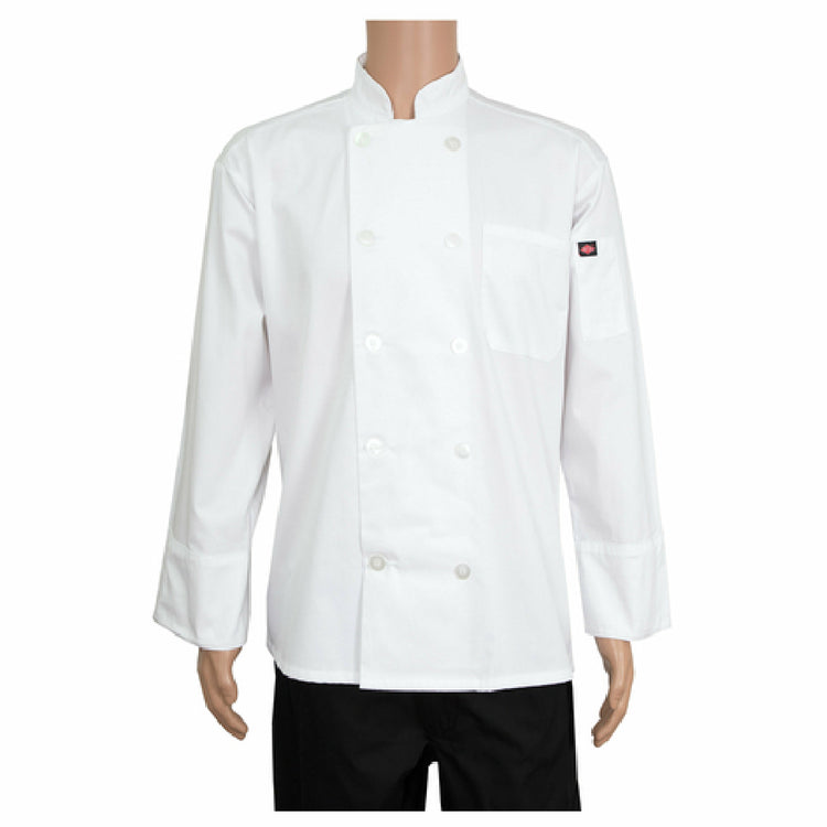 The John Ritzenthaler Company RZCOATWHM Ritz® Kitchen Wears™ Chef's Coat 10-button Long Sleeve is a professional-grade unisex chef's coat designed for high-performance culinary environments. Crafted from durable cotton/poly twill, this chef's apparel features a long sleeve configuration with a reversible closure and a 10-button front for secure, adjustable fit. Its technical design includes a left front pocket for essential tools and a thermometer pocket on the sleeve for temperature monitoring, making it suitable for demanding foodservice applications such as commercial kitchens, restaurants, and catering operations. The coat is optimized for medium (40-42) sizes and ensures reliable durability, comfort, and functional efficiency for culinary staff.