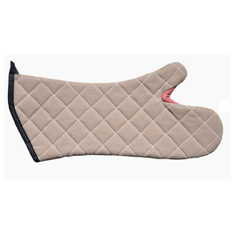 A commercial oven mitt is a high-performance protective glove designed to safeguard hands from thermal hazards in professional kitchen settings. Made from heat-resistant materials like Kevlar, it typically features a length of around 13 inches to provide comprehensive coverage when handling hot cookware, baking trays, and equipment. Used primarily in restaurant kitchens, cafeterias, and catering operations, this type of oven mitt supports safe and efficient workflow during high-temperature food preparation and serving tasks, ensuring operator safety and maintaining operational standards in busy environments.