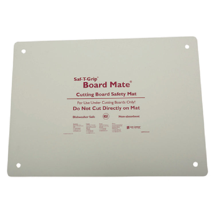 A commercial cutting board mat is a resilient, slip-resistant accessory used to provide a stable surface during food preparation. The San Jamar CBM1318 Cutting Board-Mate® is specifically designed to prevent cutting boards from sliding, thereby enhancing safety and workflow in busy foodservice environments. Made from durable synthetic rubber, it withstands frequent dishwasher cleaning and high temperatures, making it an essential component for maintaining hygiene and operational efficiency in moderate-volume kitchens. Installed underneath standard cutting boards, it helps minimize cross-contamination and accidental slips, ideal for restaurant, catering, and institutional food prep applications.