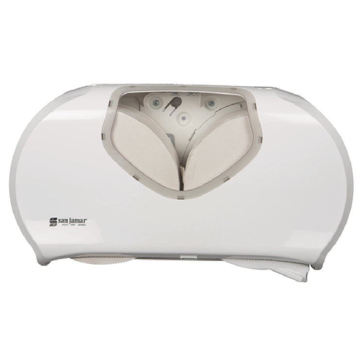 San Jamar, R4070WHCL, Summit Twin Bath Tissue Dispenser, 20-1/4"W x 11-9/10"D x 5-7/8"H, fits (2) 9" jumbo rolls, full swing replaceable cover, sliding panel, see-thru gauge, break & chemical resistant plastic, white/clear (250 each minimum order)