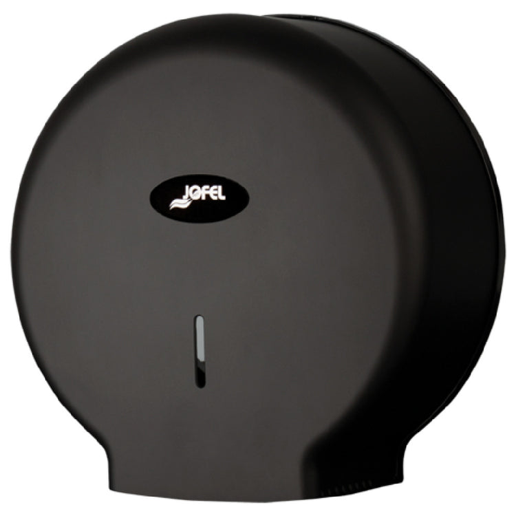 The San Jamar R6100MBK Jofel Valor Single Tissue Dispenser employs a plastic construction with dimensions of 13.39 inches in width, 4.92 inches in depth, and 13.11 inches in height, weighing approximately 2.45 pounds. The unit is designed for standard 10-inch jumbo rolls, providing consistent tissue dispensing. Its ease of access is facilitated by a hinged cover, while the viewing window allows quick visual inspection of tissue levels. The lock feature ensures security in high-traffic areas, and the overall design supports typical restroom and washroom operations. The dispenser requires no electrical connections, focusing solely on mechanical operation and durability for continuous service in commercial environments.