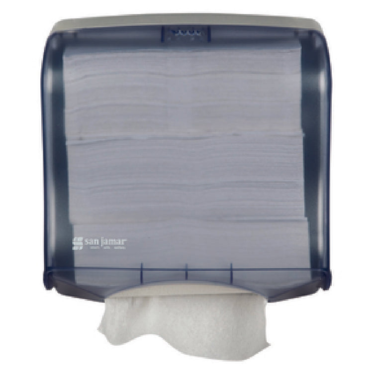 The San Jamar T1755TBL Ultrafold™ Fusion™ Classic Towel Dispenser is a high-capacity, wall-mounted paper towel dispensing unit designed for commercial foodservice environments. Constructed from durable impact-resistant plastic, this dispenser features a translucent arctic blue finish, measuring 11-1/2" wide by 6" deep by 11-1/2" high. Its key feature is the innovative Present® System, engineered to optimize workflow and minimize waste, and it accommodates 240 C-fold or 400 multifold towels, making it suitable for mid-volume restaurant operations, cafeterias, and hospitality settings seeking efficient hand hygiene solutions without frequent refilling. This dispenser ensures secure locking and precise towel presentation, supporting hygienic and organized foodservice environments.