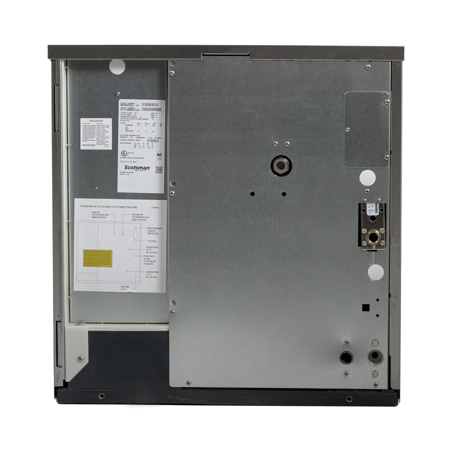 The Scotsman MC0322MW-1 ice maker operates on a 115V, 60Hz, single-phase power supply with a draw of 11.9 amps and a rated wattage suitable for commercial installations. Its water-cooled refrigeration system ensures efficient heat exchange, featuring a self-contained condenser for simplified setup. The unit produces up to 301-400 pounds of full-size dice cubes per 24 hours, with dimensions of 22 inches in width, 24 inches in depth, and 23 inches in height, weighing approximately 155 lbs in operation. The stainless steel exterior offers a sleek, corrosion-resistant surface, while AgION antimicrobial protection enhances sanitization. Compliance with NSF and cULus standards reflects its suitability for food-safe environments. Designed for ease of maintenance, it includes a QR code for unit-specific information, along with self-cleaning features, and requires minimal clearance for airflow and drainage as per installation guidelines.