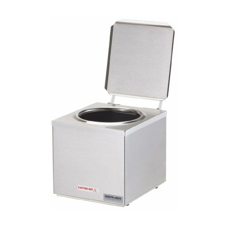 The Server Products 92000 DI-1 SINGLE CONE DIP WARMER 3 Qt. Low Temperature Warmer is a commercial-grade countertop food warming unit engineered for precise temperature regulation and optimal cone dipping performance. Designed with natural convection heating, it ensures gentle, even warming of cone dips without overheating. The unit features an adjustable temperature range from ambient temperature to 150°F, with marked low to high settings, making it suitable for professional foodservice environments that require consistent product presentation and safe holding of hot dips. Built with stainless steel construction, it offers durability and ease of sanitation, and includes a hinged lid for accessibility. Powered by 100 watts, operates on a 120V single-phase supply with a NEMA 5-15P plug, aligning with standard commercial electrical specifications. Compatible with a stainless steel jar (94009) or a manufacturer's #10 can of cone dip, this warmer provides a reliable solution for cone dipping applications in cafes, snack bars, and catering operations.