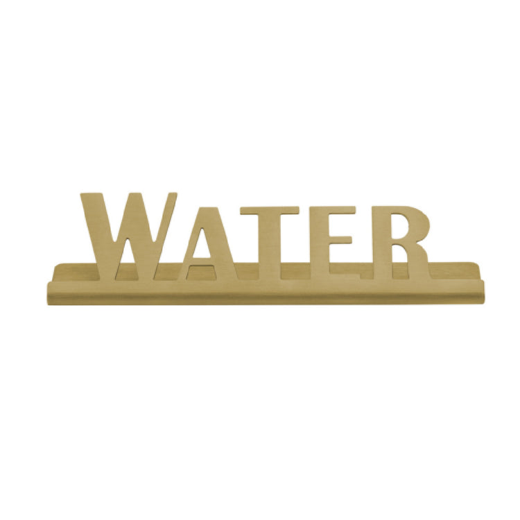 The Service Ideas 1C-ST-WATER-SIGN-VG Table Sign "Water" is a durable, laser-cut metal signage solution designed for quick identification in commercial foodservice environments. Measuring 1 inch in height and 4-1/2 inches in width, this stainless steel sign features a vintage gold finish, combining visibility with a refined appearance. Crafted in the USA, it offers dishwasher-safe properties suitable for frequent cleaning, with hand washing recommended to maintain its integrity. Its straightforward size and expert-grade construction make it ideal for tabletop applications in hospitality, catering, and foodservice operations seeking reliable, aesthetic communication tools.