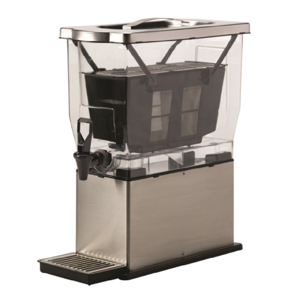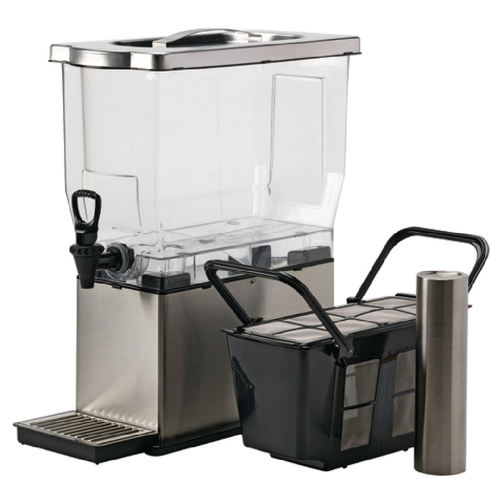 The Service Ideas CBNS3SS Cold Brew 'N' Serv™ System is a commercial-grade beverage dispenser designed for efficient high-volume cold brew coffee service. Constructed with durable stainless steel and featuring a BPA-free plastic container, this rectangular 3-gallon (384 oz.) unit measures 8-1/4" x 17-1/2" x 20", making it suitable for busy coffee stations and hospitality settings. Its integrated cold brew basket, capable of accommodating 3 pounds of coffee grounds, facilitates precise infusion. The model includes a robust spigot, a drip tray, and a brushed stainless steel lid and base for long-term wear, ensuring consistent performance in demanding foodservice environments. Its technical specifications focus on durability and ease of maintenance, providing a reliable solution for continuous cold brew coffee dispensing.