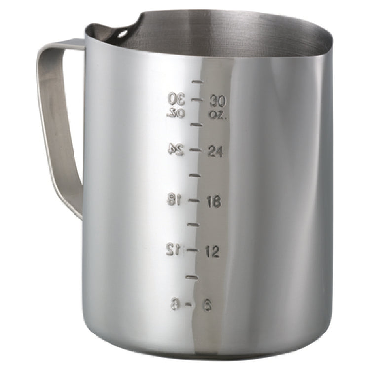 Service Ideas, FROTH326, Frothing Pitcher, 0.95 liter (32 oz.), 4" x 6" x 5", with handle, dishwasher safe, graduated markings with 6 oz. increments interior & exterior, thermometer rest (thermometer sold separately), stainless steel, brushed finish (Priced per each, packed 24 each per case)