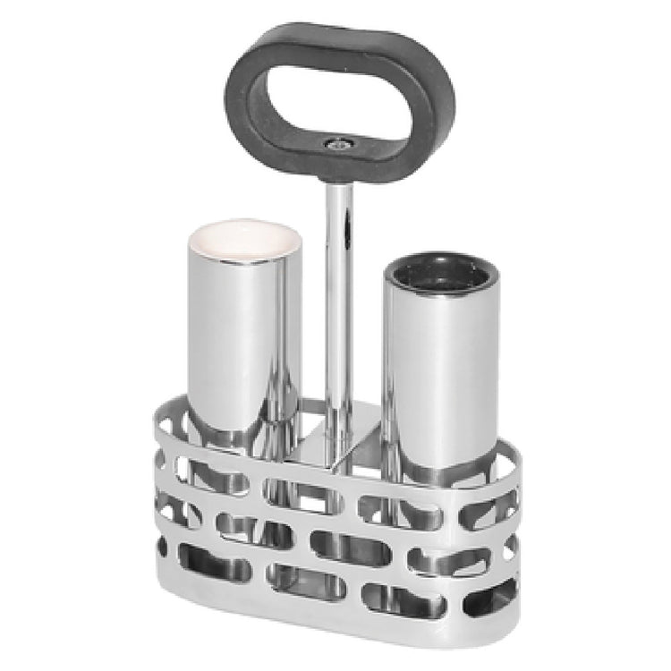 The Service Ideas SM-66 Mod18 Steelworks Salt & Pepper Shakers Set With Rack is a commercial-grade condiment dispenser designed for professional foodservice environments. Crafted from durable 18/8 stainless steel, this set features cylindrical salt and pepper shakers with colored tops, measuring 6-1/4" in height and 1-1/4" in diameter. The included caddy with silicone handle facilitates stable placement and easy transport, while dishwasher-safe construction ensures straightforward cleaning. Its high-quality materials and polished finish make it suitable for frequent use in busy restaurant or cafeteria settings, providing reliable, hygienic seasoning station solutions for high-volume foodservice operations.