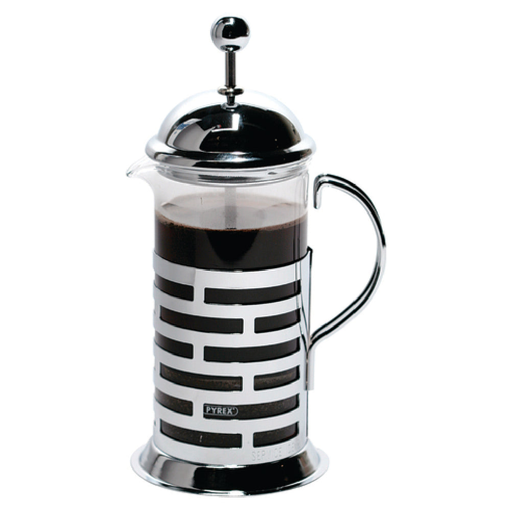 The Service Ideas T277B French Coffee Press features a self-contained design with a chrome finish on an 18/8 stainless steel body, providing long-lasting durability. It has a height of 7-3/4", width of 3-1/2", and depth of 4-1/2", with a weight of 1.12 lbs. The unit is suitable for dishwasher cleaning, with a Pyrex® glass liner resistant to temperature variations up to standard brewing ranges. Its construction supports heat retention of 2-3 hours, making it effective for brewed beverages in commercial settings. The press operates independently without electrical requirements, designed for easy disassembly for cleaning and routine maintenance.